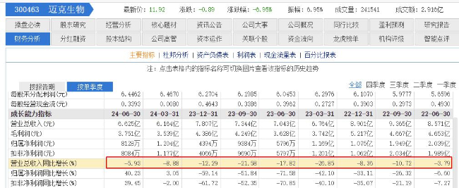 综合历年财报看,自2021年第二季度起,迈克生物的单季营收同比连续13个季度一直处于下滑状态,截至2024年中报仍未止住颓势。