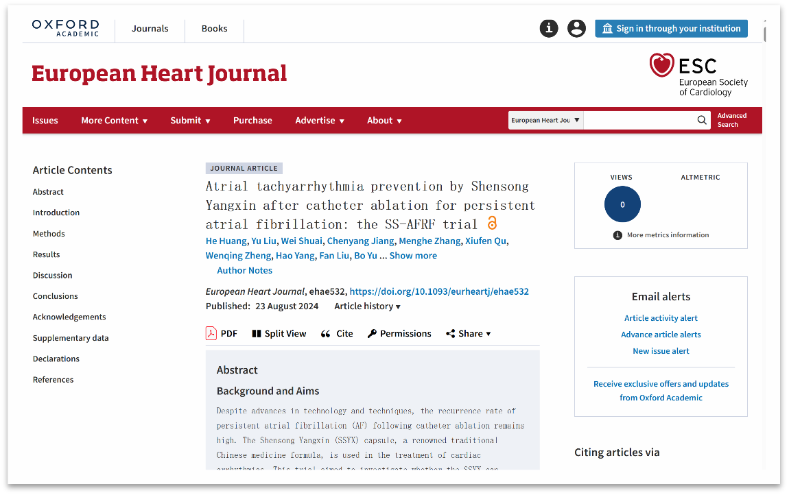 欧洲时间8月23日,国际心血管病领域顶级期刊《欧洲心脏杂志》(European Heart Journal)刊登了由中国武汉大学人民医院黄鹤教授团队牵头完成的“参松养心对经射频消融房颤患者预后临床研究”论文《持续性房颤导管消融后参松养心胶囊预防房性快速性心律失常:SS-AFRF试验》。论文指出,参松养心可有效降低持续性房颤患者射频消融术后一年内复发风险40%。
