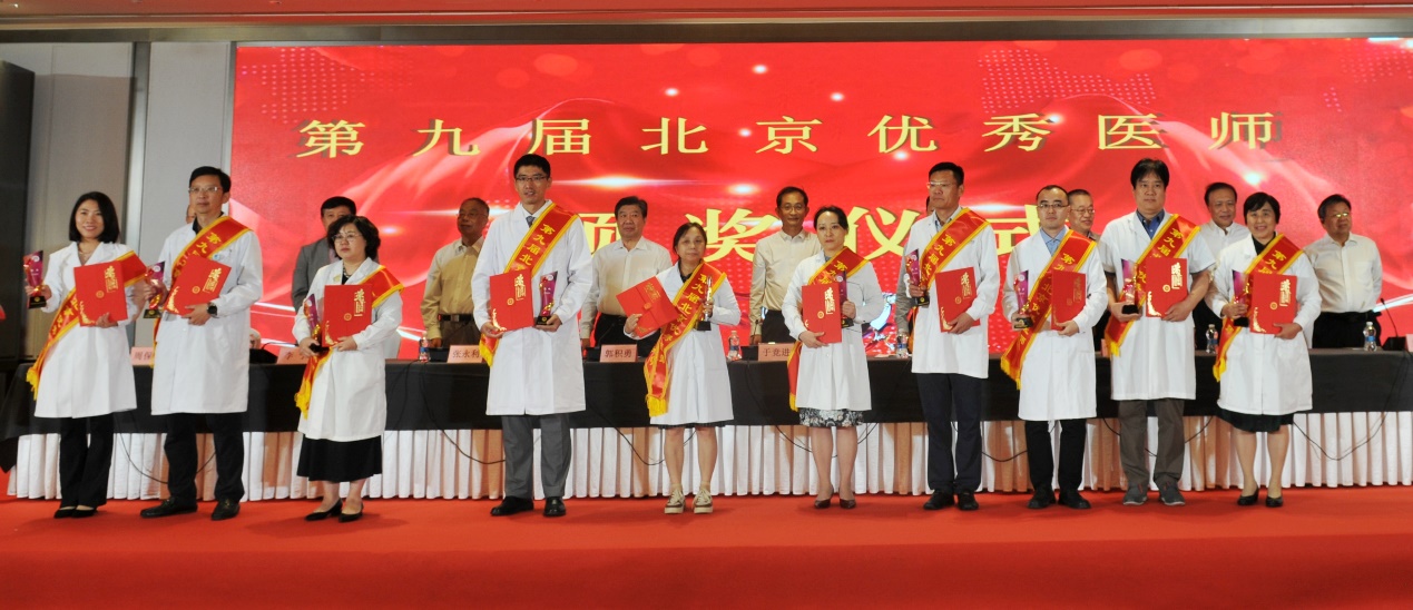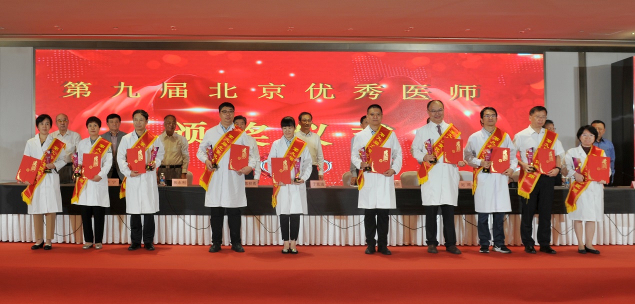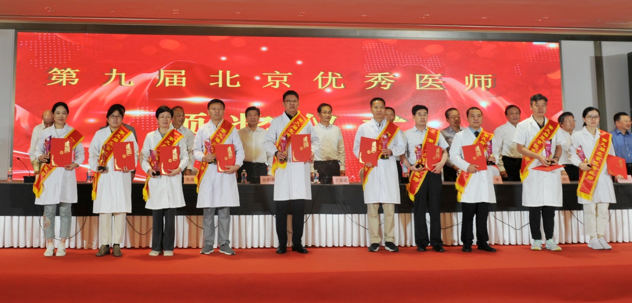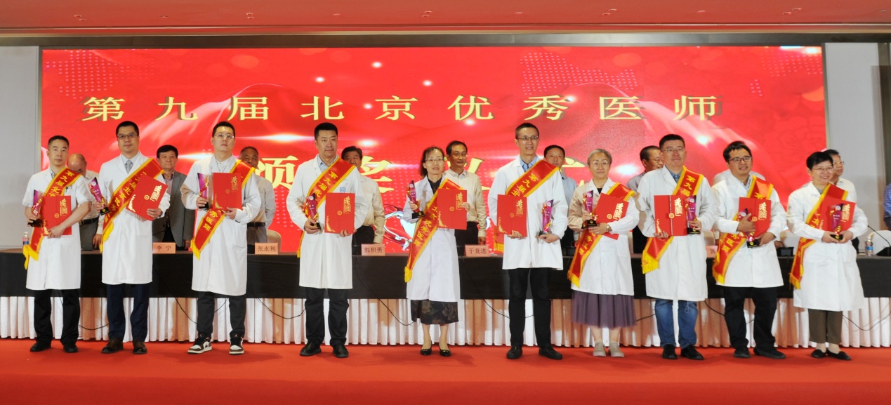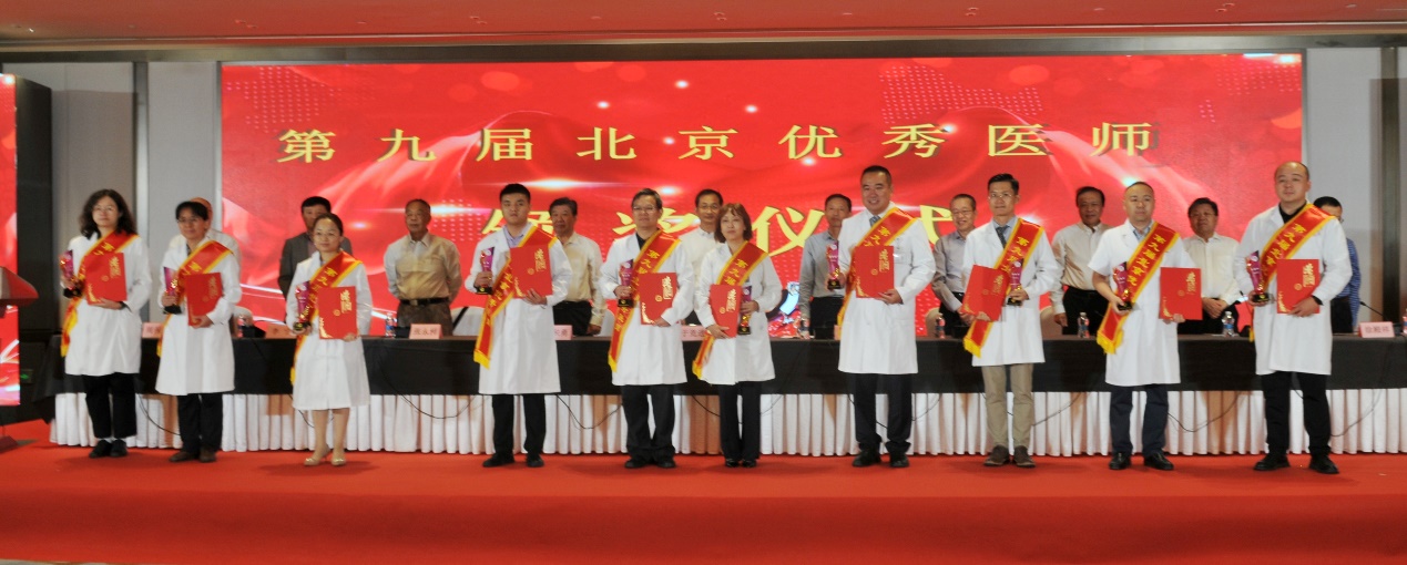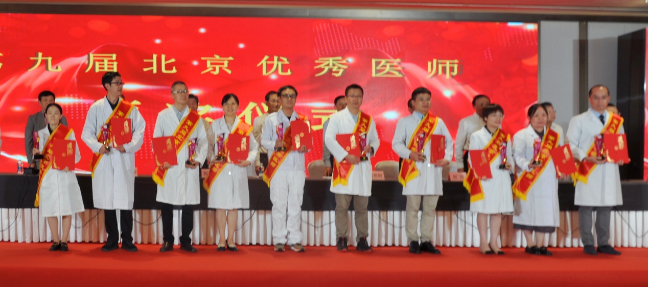 领导致词结束后,中国医师协会领导、北京卫生健康委领导和北京医师协会领导共同向获得《第九届北京优秀医师》的医师颁发证书和奖杯,并合影留念。