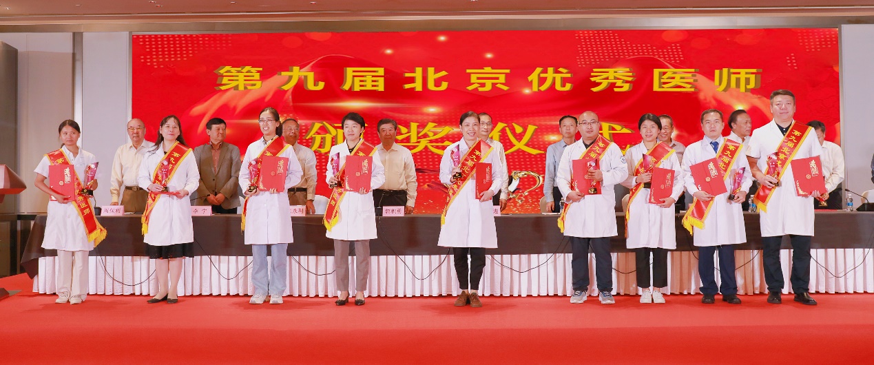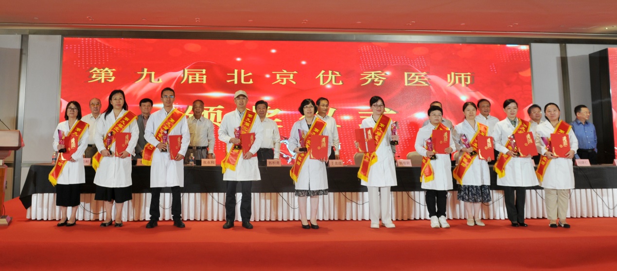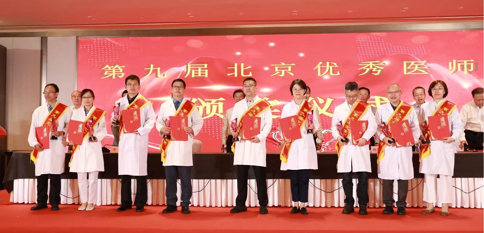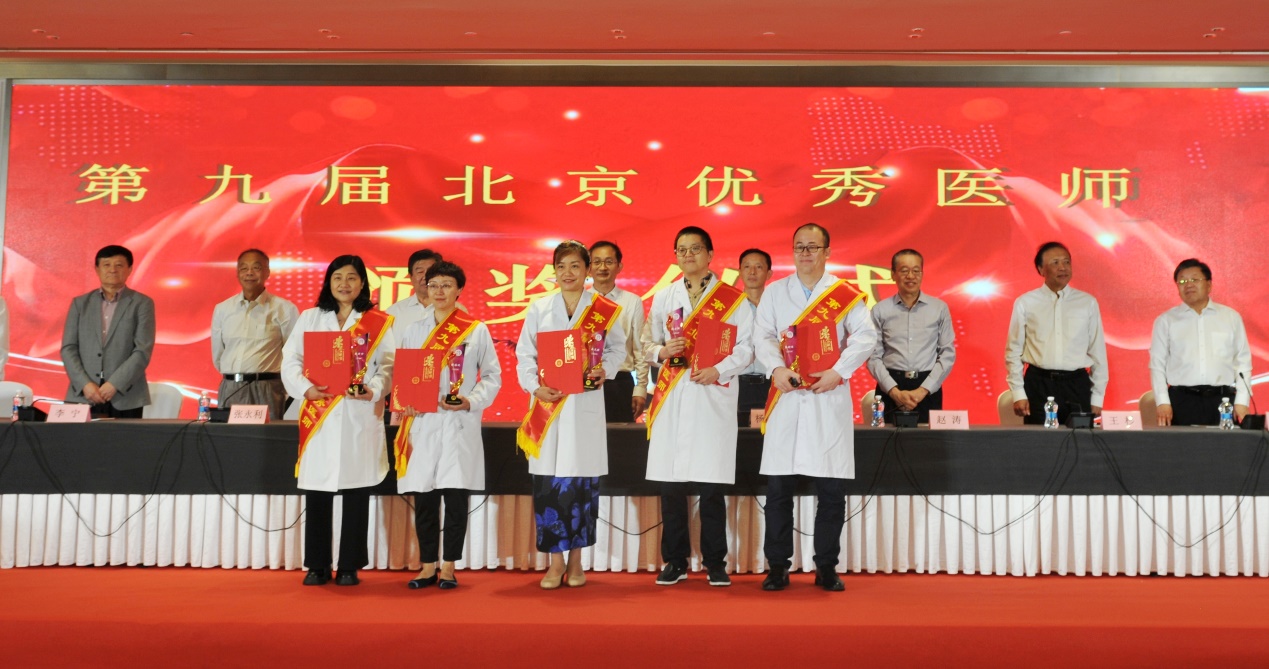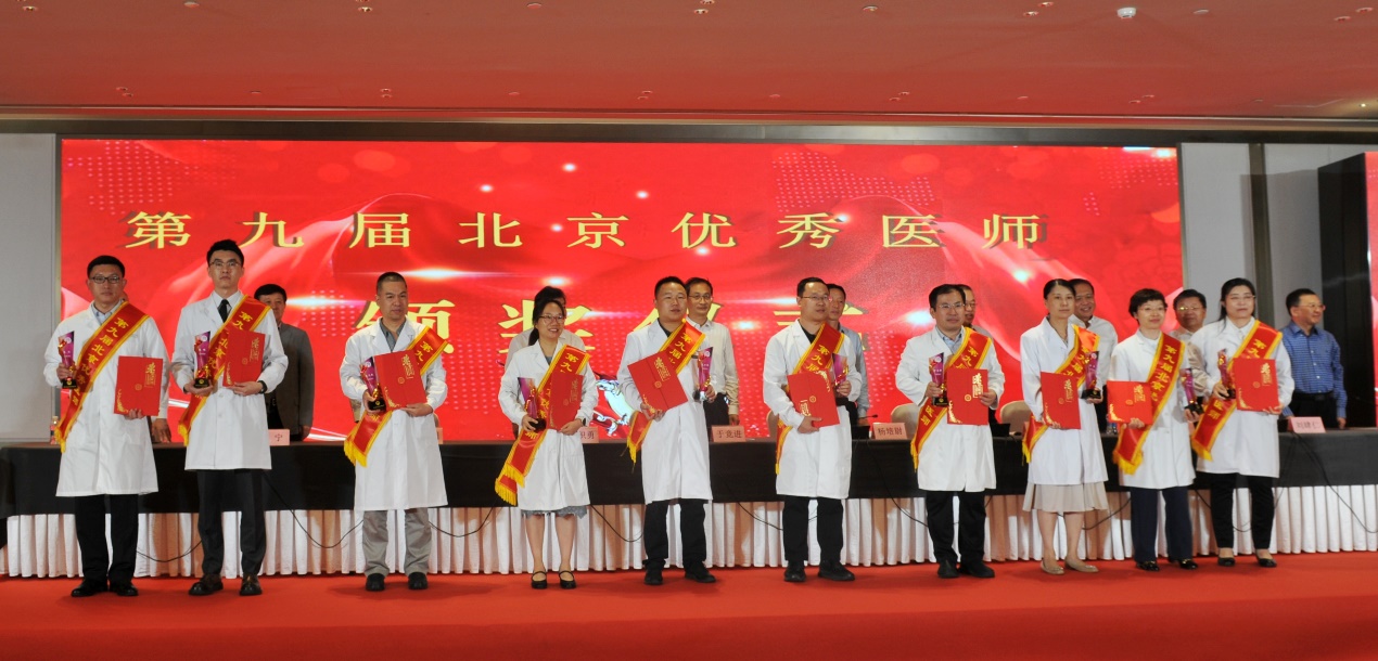 领导致词结束后,中国医师协会领导、北京卫生健康委领导和北京医师协会领导共同向获得《第九届北京优秀医师》的医师颁发证书和奖杯,并合影留念。