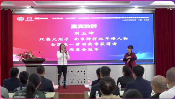 黑龙江省卫生健康委员会医政处处长赵静兰、黑龙江省残疾人联合会组织联合部部长李丽双、双奥火炬手刘玉坤、黑龙江省聋人协会主席崔连和、哈尔滨市急救中心党委书记兼主任姜国林、北京依众公益基金会副理事长赵晖等嘉宾为活动致辞,中国聋人协会秘书长赵琳娜通过视频寄语的方式为活动致辞。北京依众公益基金会副理事长赵晖在致辞中提到,自2021年起,中国聋人协会联合北京依众公益基金会共同开展无障碍急救平台建设工作,并发布《听障人士120报警服务规范》团体标准。在标准工作的指导下,无障碍急救平台已在全国各省落地开通。本次基金会联合哈尔滨市急救中心顺利完成无障碍急救平台建设工作,哈尔滨市是无障碍急救平台第58座落地城市。