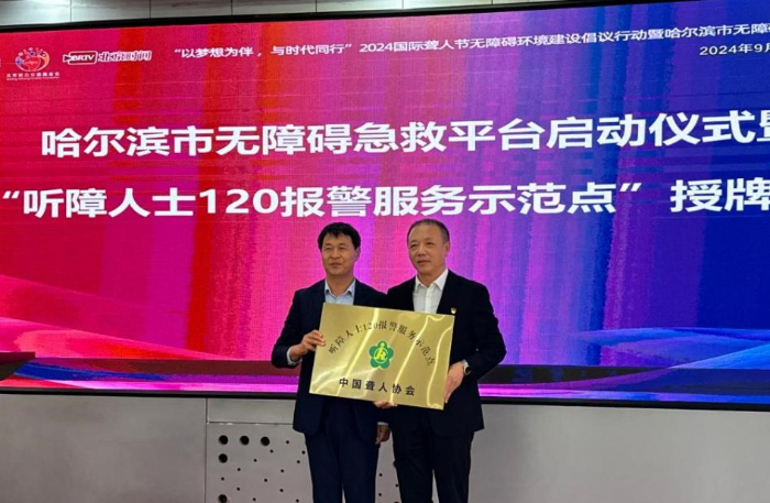 启动仪式期间,黑龙江省聋人协会主席崔连和向哈尔滨市急救中心党委书记、主任姜国林授“听障人士120报警服务示范点”铜牌。本次活动不仅关注无障碍急救平台建设,还同步发起推进无障碍环境建设的行动倡议。强调无障碍环境建设多方协同的重要性,呼吁推动黑龙江省无障碍环境建设及无障碍急救平台覆盖更广泛听障群体。
