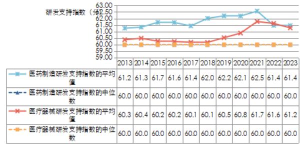 上图为中国医药企业研发支持指数二级行业历年情况