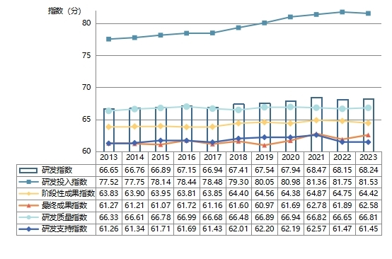 自2013年度至2023年度,这十一年的光辉历程见证了中国医药制造企业研发指数的波动增长。数据显示,在这过去的十一年间,中国医药制造企业研发指数始终保持着波动增长的态势。具体而言,该指数的平均值从2013年度的66.65分攀升至2023年度的68.24分,增幅达到1.59分,增长率为2.39%。这一积极的上升趋势在研发投入指数、研发成果指数(涵盖阶段性成果与最终成果指数)、研发质量指数以及研发支持指数这四大核心成分指数中均得到了充分体现。尤为值得一提的是,中国医药制造企业的研发投入指数表现尤为亮眼,其平均值从2013年的77.52分大幅跃升至2023年的81.53分,增长了4.01分,增长率高达5.17%。