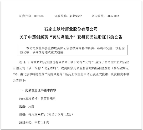 1月21日晚,以岭药业发布公告称,其全资子公司北京以岭药业有限公司收到国家药品监督管理局核准签发的《药品注册证书》,由北京以岭提交的中药1.1类创新药芪防鼻通片新药上市注册申请已获正式批准。据悉,芪防鼻通片是以岭药业获批的第15个创新专利中药。