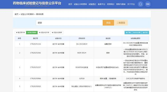 减肥药的研发热度有多高?在药物临床试验登记与信息公示平台,以“肥胖”为关键词进行搜索,可以查询到200余条适应证包含肥胖的临床试验登记信息。
