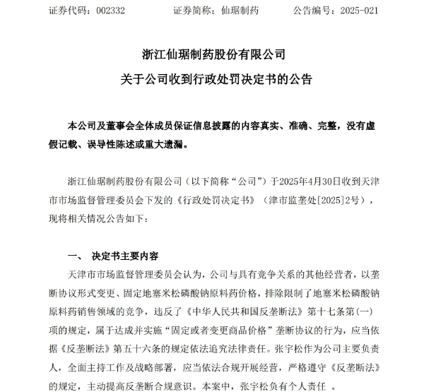 5月5日晚,仙琚制药(002332.SZ)在深交所发布公告称,公司于4月30日收到天津市市场监督管理委员会下发的《行政处罚决定书》。处罚决定认定,仙琚制药与其他具有竞争关系的经营者以垄断协议形式变更、固定地塞米松磷酸钠原料药价格,违反了《中华人民共和国反垄断法》,因此被处以罚没款合计人民币1.95亿元(其中没收违法所得2374.67万元,并处2023年销售额8%的罚款1.71亿元),公司主要负责人张宇松被处以60万元罚款,占公司上年度营收4.88%和净利润49.17%。公司公告指出,该处罚不触及重大违法强制退市情形,对公司当期财务报表造成一定负面影响,但尚不影响正常经营和发展。