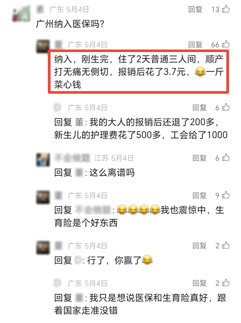 近日,一位广东网友在国家医保局微信公众号评论区介绍,自己住院分娩个人只花了3.7元,引发大家关注讨论。小编向广东的同事了解到,这位网友的情况并不是个例,今年以来,仅在广州市,就有7000多位宝妈生娃经过生育保险报销后,自己花费不到100元,其中,有881人花了不到10元(后附分娩所在医疗机构名单),甚至还有67人一分钱都没花。