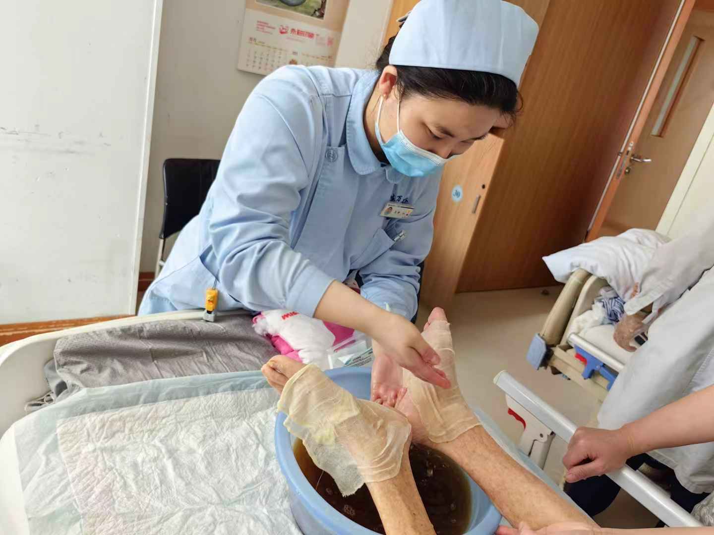 95岁的陈阿姨常年卧床,腿部丧失行走功能。经过中医医师、康复技师协同开展床边康复,老人僵硬的关节终于不再是绷紧的“弓弦”。但五病区的医护也注意到,陈阿姨常常自我揶揄:“活到70岁就够了,现在都90多了。”言语间充满了些许悲观,也不怎么爱吃饭。医护们每天都会来到床边跟老人聊天,一天下来,有7—8次的床旁交流。