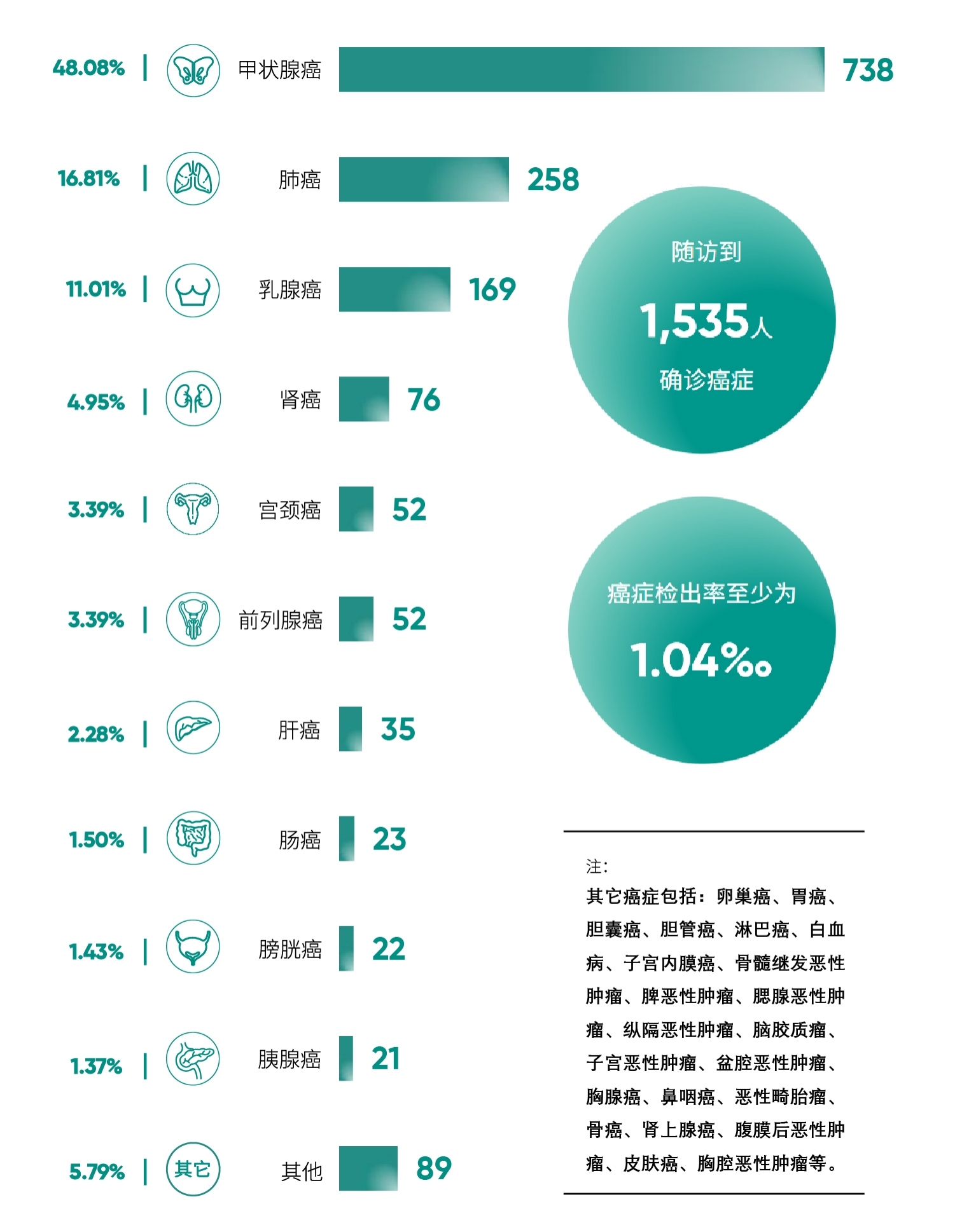 仅去年一年,在北京市近150万体检人群中,爱康集团已随访到1,535人确诊癌症。也就是每1,000位参加体检的北京居民中至少就有1人确诊癌症,其中随访到的甲状腺癌患者数高居TOP1,检出率高达48%,同样位于前列的是肺癌、乳腺癌等。随着癌症随访工作的持续进行,体检人群的癌症检出率会逐渐升高。以2024版《北京健康报告》为例,在癌症随访工作的持续推进下,截至2025年4月30日,上述体检人群中癌症检出率已经从1.04‰上升至2.30‰。