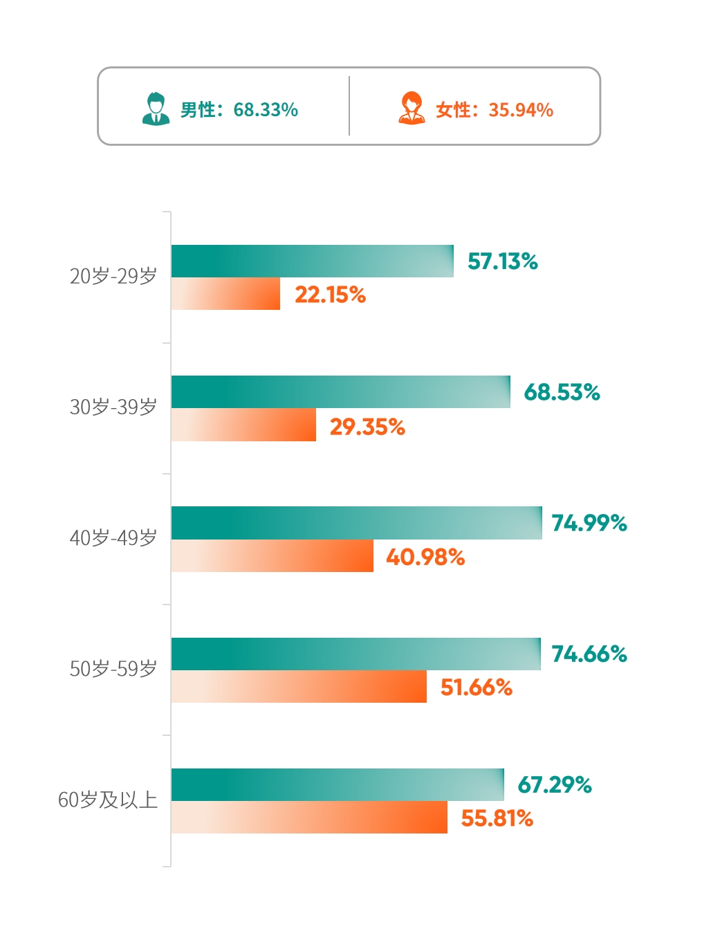 负“重”前行也在对肝脏发起“精准打击”,北京市男性体检人群的脂肪肝(超声)检出率达到55.11%,且在各个年龄段均高于女性,人到中年,更是要小心“肝”,40岁-49岁的北京男性是脂肪肝高发的“重灾区”,检出率超过63%。