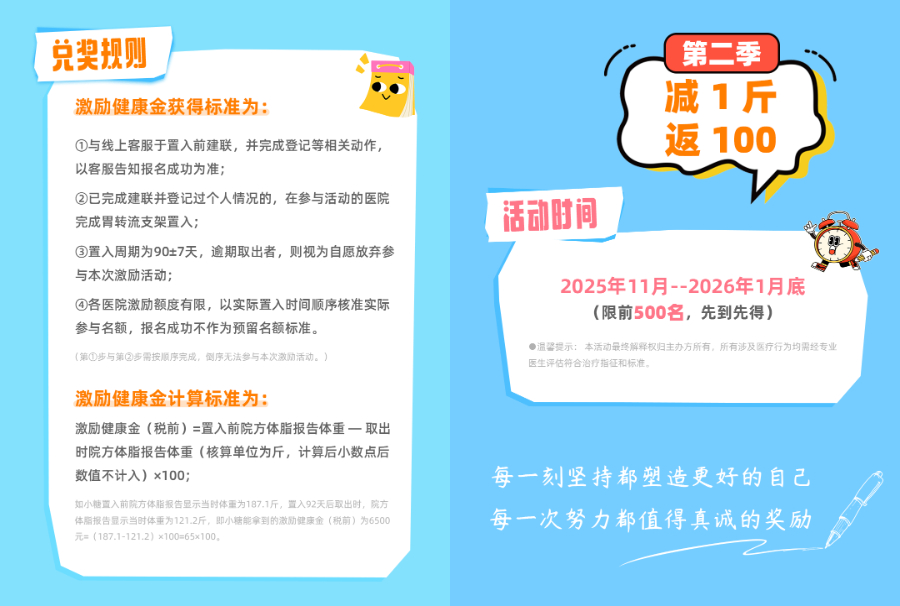 挑战期间,每位参与者的体重变化将根据活动医院出具的体脂成分报告进行记录与确认。按照规则,每减1斤体重可获得100元激励健康金(税前),让坚持与努力得到切实的回报。活动时间为2025年11月至2026年1月底,限前500名报名者参加。