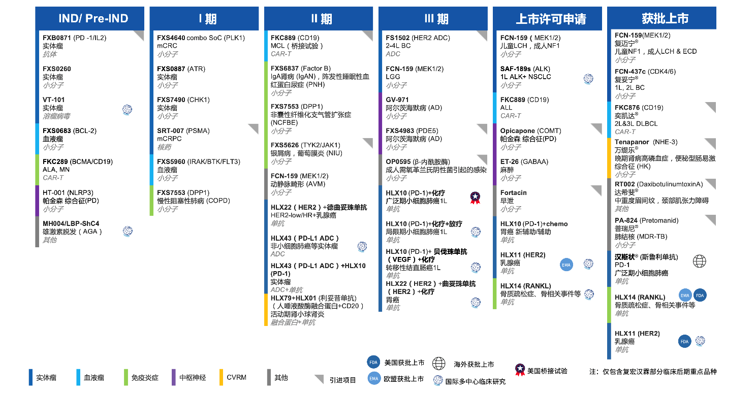 复星医药以创新药为发展重点,围绕肿瘤(实体瘤、血液瘤)、免疫炎症、神经退行性疾病三大核心领域,通过自主研发、合作开发、许可引进等持续强化管线建设。