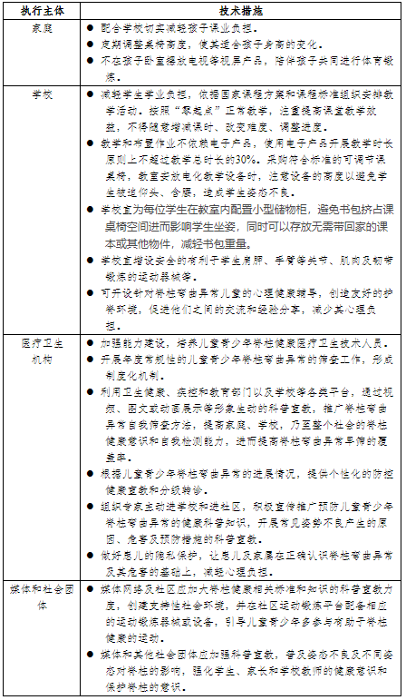 个体、家庭、学校、医疗卫生机构、媒体和其他社会团体等各界力量要主动参与建设有利于学生脊柱健康的社会环境。家庭和学校依据国家相关政策和标准要求,减轻学生学业负担,创造友好护脊环境;医疗卫生机构积极推广和普及脊柱弯曲异常的筛查技能;媒体和社区加大相关标准和知识宣传力度,创建支持性社会环境。