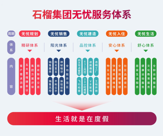 据了解,石榴集团的无忧服务体系,概括起来分为五大子体系,确保业主在规划、销售、建造、入住、生活等方面,受到全程呵护。即:以精研体系保障无忧规划,以阳光体系落实无忧销售,以品控体系确保无忧建造,以安心体系提升无忧入住,以舒心体系守护无忧生活,打造全时、全龄、全境有机生长型社区,为业主提供全生命周期的服务。