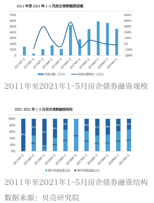 从融资结构来看,5月境外和境内融资发行债券分别为15笔和37笔,融资规模分别为254亿元人民币及393亿元人民币。贝壳研究员高级分析师潘浩表示:“虽然境内债券仍保持着年内债券市场的主导地位,但占比下滑明显。”