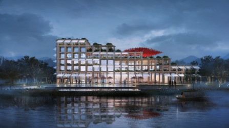 会客厅临水而造,以塑造当代滨水美学空间为目的。其场地形态,取自曲水流觞,呈南北向蜿蜒,从高空往下看,像是九曲回肠的溪边会饮宾客的场景,与“会客”之意暗合。其建筑形态,以酒器的“器”字为设计灵感,形似堆叠起来的黄酒坛,与黄酒主题呼应。