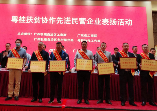 本次活动由广西自治区工商联、广东省工商联、自治区乡村振兴局、粤桂协作工作队联合举办,会议充分肯定了民营企业参与粤桂扶贫协作取得的成绩,对在助力广西脱贫攻坚和乡村振兴中涌现出的无私奉献、事迹突出、群众公认的带贫益贫先进典型进行通报表扬。龙光集团积极响应政府号召,大力支持和参与乡村振兴,获得认可,被评为“粤桂扶贫协作先进民营企业”。