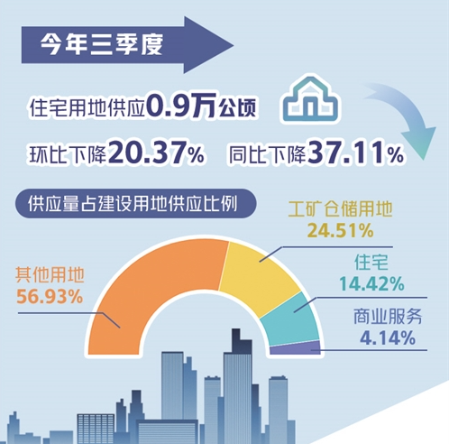 中国国土勘测规划院新近发布的全国主要城市地价监测报告显示,三季度住宅用地供应0.9万公顷,环比下降20.37%,同比下降37.11%,住宅用地供应同比增速为2015年以来单季最低。