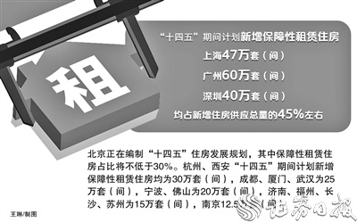 据了解,“十四五”期间,上海计划新增保障性租赁住房47万套(间)、广州计划新增60万套(间)、深圳计划新增40万套(间),均占新增住房供应总量的45%左右。北京正在编制“十四五”住房发展规划,其中保障性租赁住房占比将不低于30%。杭州、西安“十四五”期间计划新增保障性租赁住房均为30万套(间),成都、厦门、武汉为25万套(间),宁波、佛山为20万套(间),济南、福州、长沙、苏州为15万套(间),南京12.5万套(间)。