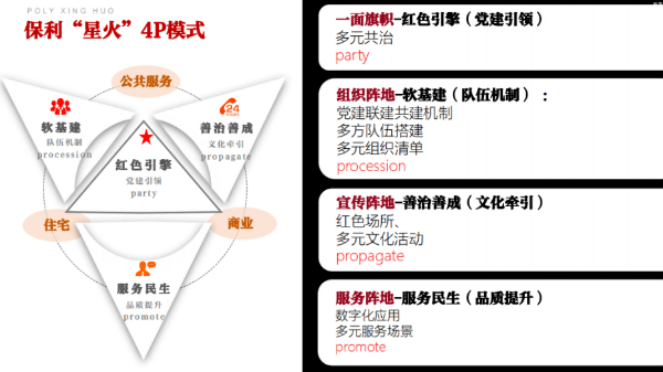 “星火模式”内核可总结为星火4P体系,即“一面旗帜,三个阵地”(party党建引领、processin队伍机制、propagate文化牵引、promote品质提升),让党建引领融入物业服务,协同社会基层治理。