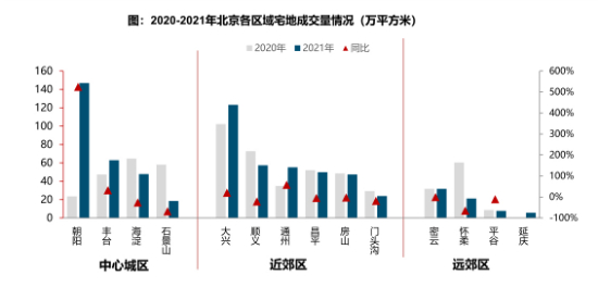 事实上,这已经不是第一次近郊区成为北京土地供应的主力区域。中指数据显示,2021年近郊六区累计成交规模356.70万平,占比51%,其中大兴为成交主力区域,成交规模超123万平;中心城区宅地成交规模276.01万平,占比为39%;受供应放量的带动,朝阳区为宅地成交主力区,累计成交规模达146.90万平;远郊四区宅地成交规模66.11万平,其中密云区成交规模31.69万平,为远郊宅地成交最多区域。