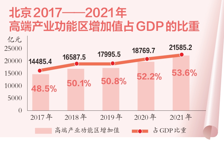 重点功能区呈现集聚效应。中关村国家自主创新示范区等高端产业功能区占据全市经济总量的半壁江山,2021年实现增加值2.2万亿元,占全市GDP的53.6%,比2016年提高5.3个百分点。