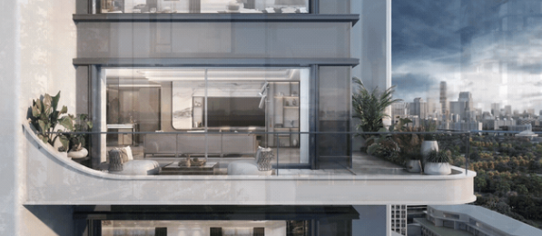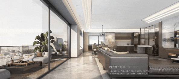 270°L型超广角空中露台,呈现宽阔无垠的城市瞰景视野。阳台自然连接室内空间,三面全景落地窗辅助,将空间彻底融入到都会景观中,形成内庭外园的居家秩序。
