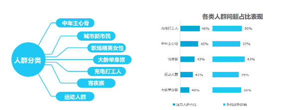 《报告》显示,当前有近6成的国民受到不同层次的睡眠问题困扰,睡眠问题已经广泛影响到不同地域、不同性别、不同年龄段人群,真正成为不可忽视的全民问题。从整体人群调研看,睡眠浅易醒和睡眠时间不达标是当下国民普遍存在的睡眠困扰,占比达到45%和41%。根据睡眠健康七类细分人群画像分析,有压力人士占比均超过40%。从睡前行为来看,手机娱乐是影响他们睡眠的最主要因素,平均占比接近4成。