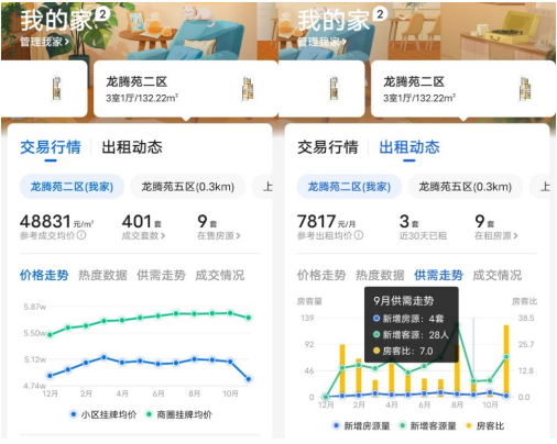 众所周知,价格、成交量、带看量等市场信息,是租售双方达成共识、精准决策的重要参考。此次升级的“交易行情动态”版块,用户能够更直观地查询小区及商圈的房屋租售的挂牌价格走势、小区成交历史、在租在售房源情况等核心信息。