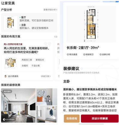 同样,新版本还特别突出了贝壳的特色服务。比如,聚焦在卖房、出租的“资产管理”模块,不仅提供了资产报盘与估价服务,还可以直接找到专业的服务者。同样,聚焦在家装、家居的“让家变美”模块,不仅可以根据房产实际情况为用户提供专属户型解析和装修参考方案,还可以提供家装设计师咨询。