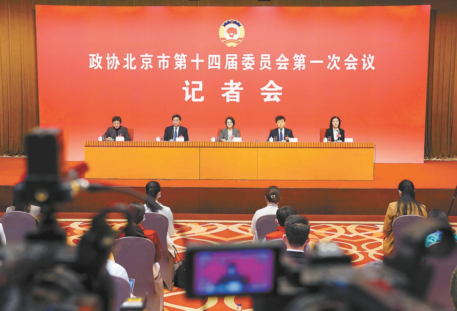 昨天,市政协十四届一次会议举行记者会。李岩、许槟、吴晨、钱嘉宏四位委员围绕“贯彻落实中共二十大精神,为深入推进首都城市更新、打造宜居环境献计出力”主题建言献策,并回答记者提问。图为记者会现场(方非/摄)