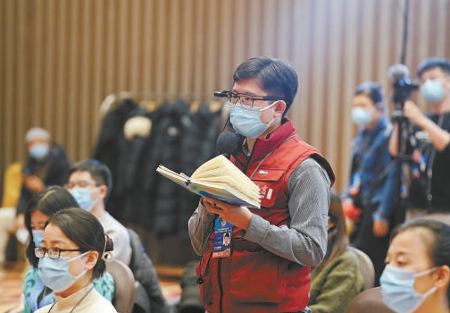昨天,市政协十四届一次会议举行记者会。图为本报记者戴着AR眼镜向委员提问(方非/摄)
