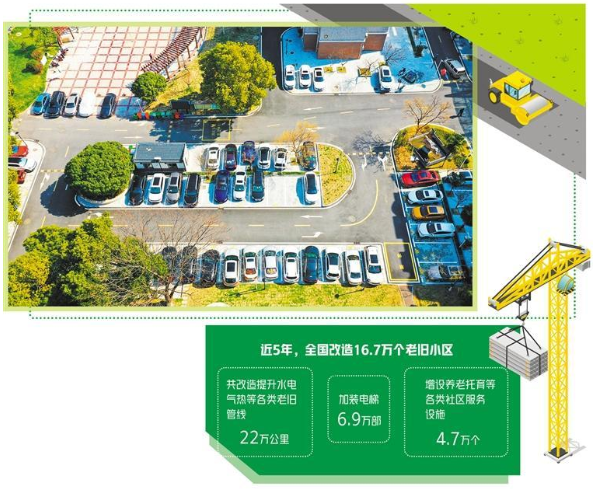 近年来,老旧小区改造取得积极进展。住房和城乡建设部最新统计数据显示,近年来,各地在老旧小区改造中,共改造提升水电气热等各类老旧管线22万公里,加装电梯6.9万部,增设停车位240万个、电动汽车充电桩6.8万个,增设养老托育等各类社区服务设施4.7万个。