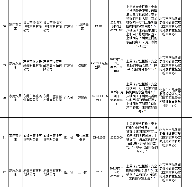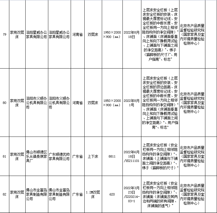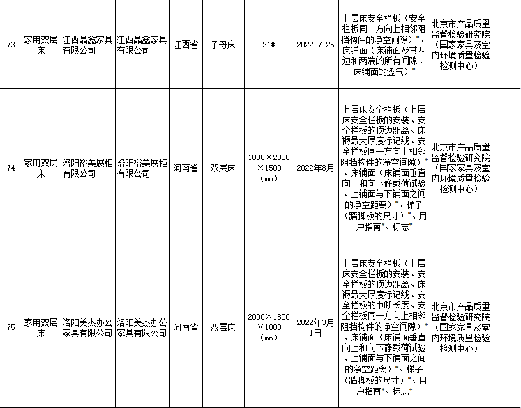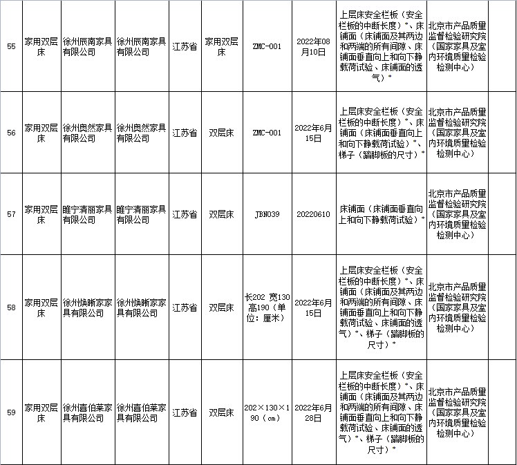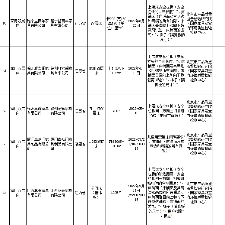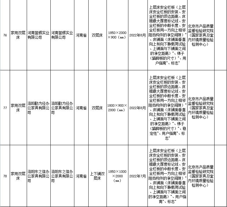 本次抽查重点对家用双层床的上层床安全栏板、儿童用双层床间隙要求、床铺面、梯子、框架和紧固件的强度、稳定性、上层床和下层床的紧固件、用户指南、标志、甲醛释放量、重金属含量(限色漆)等11类项目进行检验。不合格项目均为安全项目,涉及床铺面、上层床安全栏板、梯子、儿童用双层床间隙要求、稳定性、用户指南、标志、重金属含量(限色漆)等。