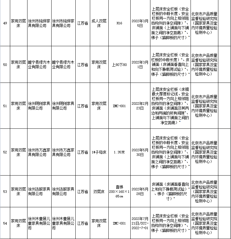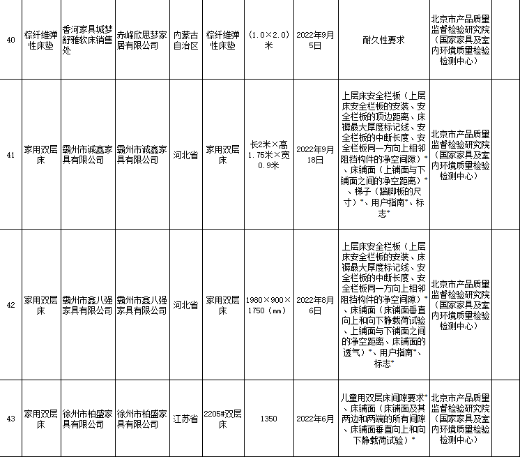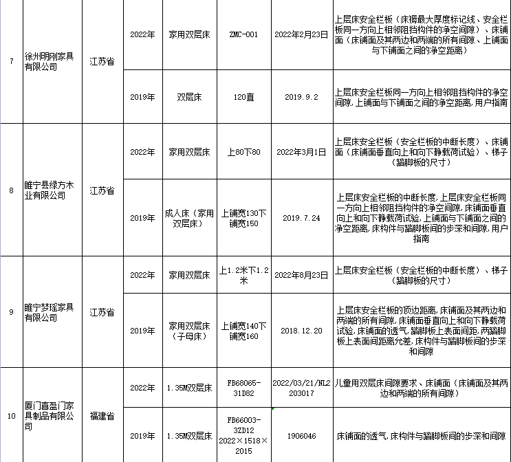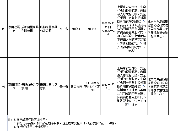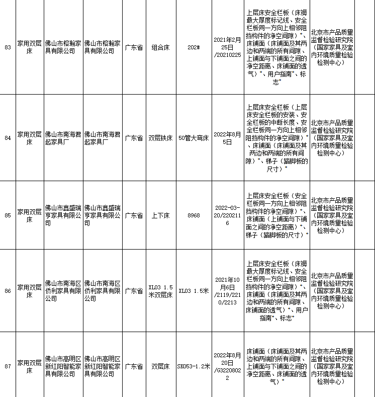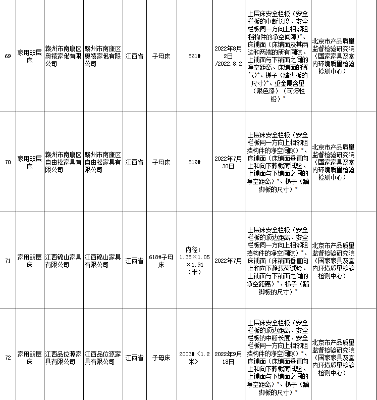本次抽查重点对家用双层床的上层床安全栏板、儿童用双层床间隙要求、床铺面、梯子、框架和紧固件的强度、稳定性、上层床和下层床的紧固件、用户指南、标志、甲醛释放量、重金属含量(限色漆)等11类项目进行检验。不合格项目均为安全项目,涉及床铺面、上层床安全栏板、梯子、儿童用双层床间隙要求、稳定性、用户指南、标志、重金属含量(限色漆)等。