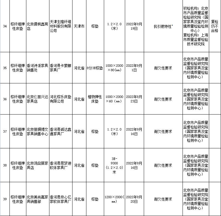 本次抽查重点对棕纤维弹性床垫的面料及复合面料物理性能(耐摩擦色牢度)、芯料物理性能、安全卫生要求、抗引燃特性、耐久性要求等5类项目进行检验。不合格项目涉及耐久性要求、抗引燃特性,其中抗引燃特性为安全项目,有1批次产品不合格。