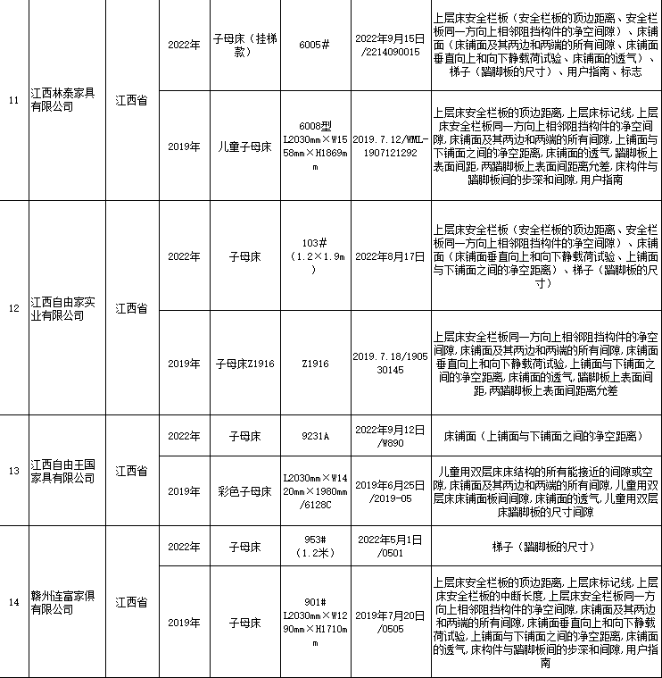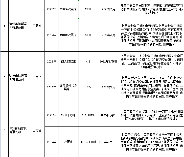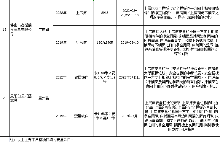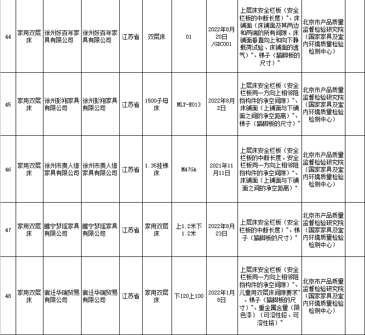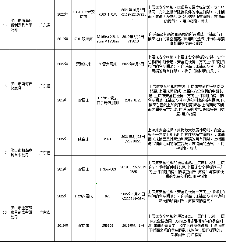 发现48批次产品床铺面项目、47批次产品上层床安全栏板项目、34批次产品梯子项目不合格。经技术机构分析,不合格的原因主要是,企业对标准理解不准确,产品设计、结构、工艺存在缺陷。安全栏板的中断长度过大,可能出现跌落伤害,过小可能造成使用不便。上层床安全栏板、梯子、床铺面等间隙不符合标准要求,可能造成肢体或手指夹伤。上铺面与下铺面之间的净空距离过小,会造成使用不便,容易磕伤。