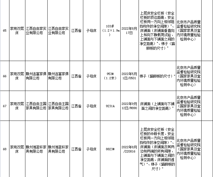 (四)家用双层床抽查不合格率为83.1%。本次抽查9个省(市)65家企业生产的65批次产品,发现54批次产品不合格,抽查不合格率为83.1 %。