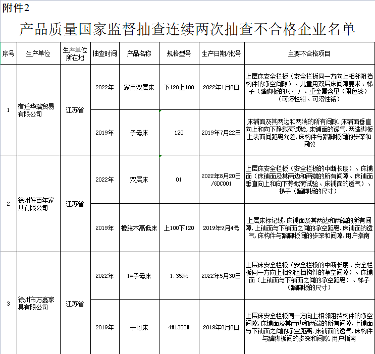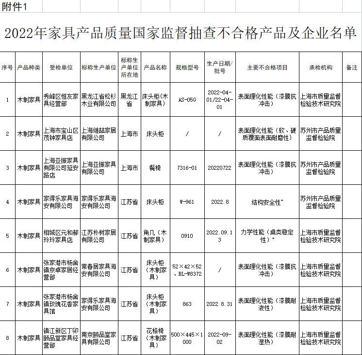 附件1:2022年家具产品质量国家监督抽查不合格产品及企业名单