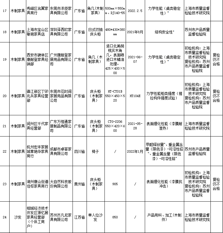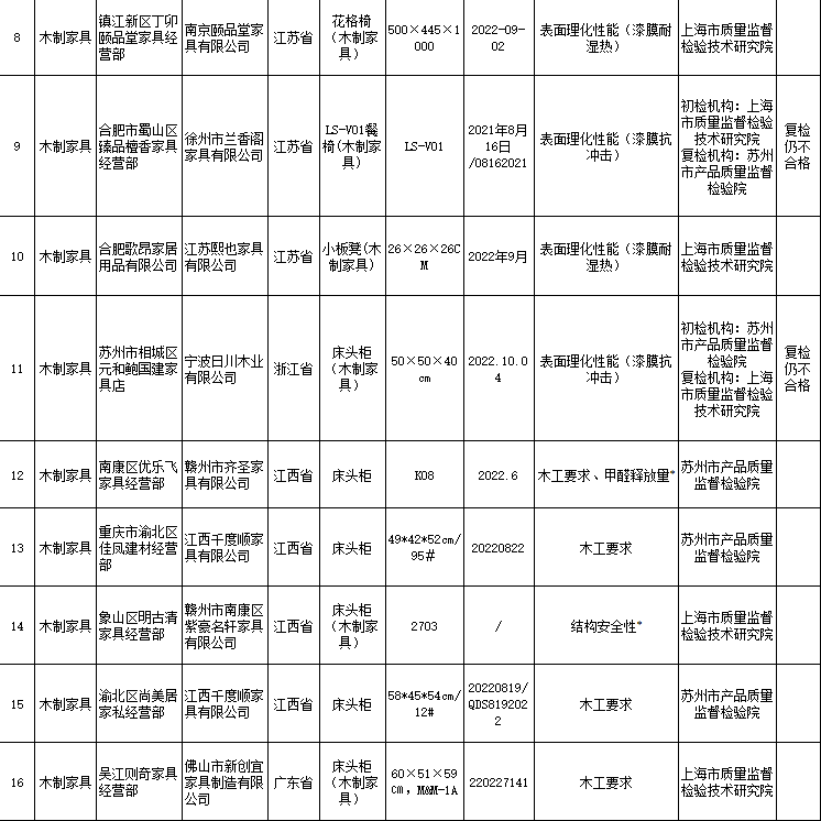 本次抽查重点对木制家具的木工要求、表面理化性能、力学性能、结构安全性、甲醛释放量、重金属含量等6类项目进行检验。不合格项目涉及木工要求、结构安全性、力学性能(桌类稳定性)、力学性能(柜类强度)、表面理化性能(漆膜)、表面理化性能(软、硬质覆面)、甲醛释放量、重金属含量(限色漆)。其中,结构安全性、力学性能(桌类稳定性)、甲醛释放量、重金属含量(限色漆)为安全项目。
