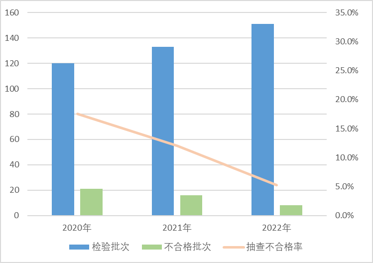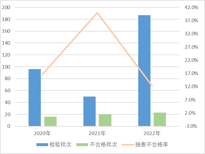 (一)木制家具抽查不合格率为12.3%。本次在流通领域抽查15个省(市)162家企业生产的187批次产品,发现23批次产品不合格,抽查不合格率为12.3%,较上次抽查下降27.7个百分点。该产品近3年抽查不合格率分别为16.7%、40.0%、12.3%。