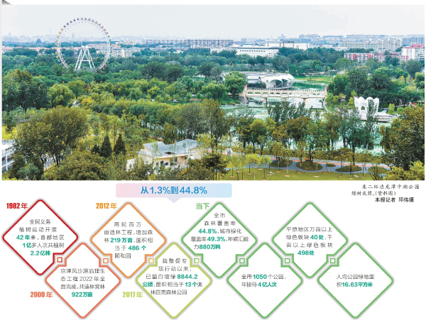 新中国成立之初,北京林木覆盖率仅有1.3%,刮风天“不裹纱巾出不了门”。现如今,北京林木覆盖率已达44.8%,推窗见绿,出门进园。梦想中的画面,在一代又一代人接续努力下,成为百姓家门口的生动实际。