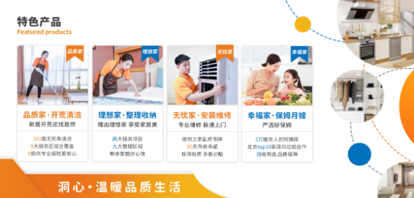 围绕消费者装修后的家居生活,洞心推出以家庭服务为中心的“品质家”、“理想家”、“幸福家”和“无忧家”四大系列产品,为消费者提供家庭清洁、整理收纳、高级家政师、保姆月嫂、婴幼看护、老人护理、安装维修、搬家运输等全方位的优质家庭服务,让客户更省心。