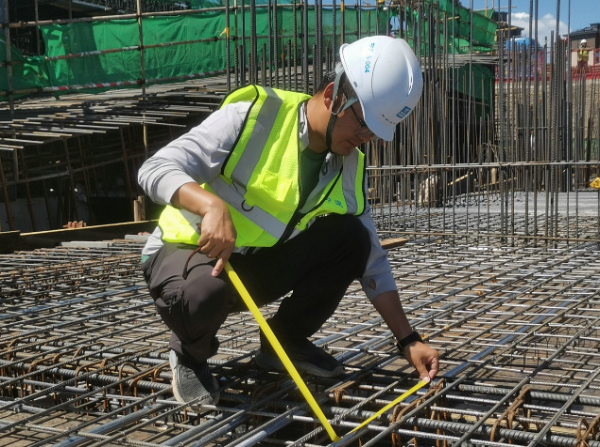 当日,工人在高温酷暑、结构复杂、施工难度大等重重考验下,为确保精确有序有效的进行施工测量 (摄影:刘晓芬)