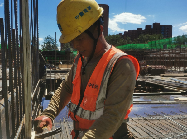 建筑工人冒着高温酷暑作业,以“战”的姿态、“抢”的意识、“拼”的精神,加紧施工中 (摄影:刘晓芬)