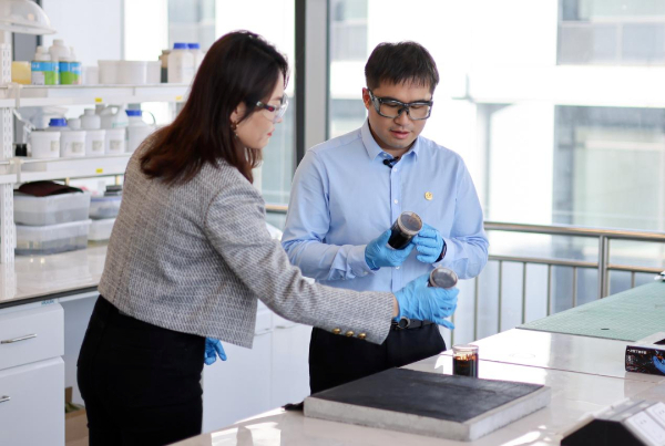 其中,沥青材料实验室占地面积约200平方米,主要开展沥青材料的制备和检测工作。沥青作为一种来源广泛的材料,主要应用于道路、防水和防腐工程。经过多年的攻关,课题组研发的一款铁路桥涵专用高聚物改性沥青防水卷材,因其耐低温和耐疲劳的特性,成为高铁项目配套的专用防水材料。