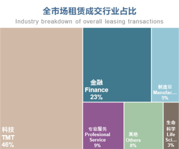 受租金在过去几个季度持续调整的影响,当前低租金环境激发了2024年第一季度甲级办公楼市场活跃度的提升。金融和科技互联网行业仍为租赁需求支柱,科技互联网行业租户贡献了近一半的甲级办公楼市场非续租成交。