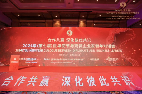 4月17日,由中国商业联合会主办的“2024年(第七届)驻华使节与商贸企业家新年对话会”在北京中国大饭店举办。