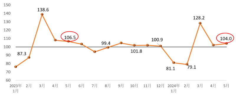 供给侧,5月份,建筑材料工业价格指数低于临界点、生产指数高于临界点。其中,建筑材料工业价格指数99.9点,比上月回升0.1点,基本持平;建筑材料工业生产指数104.1点,比上月回升1.9点。总体上,建材产品价格低位波动;建材生产活跃度较上月有所提升。